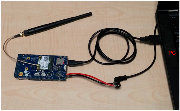 86Duino One 接上電源(注意,86Duino One 需使用外部電源輸入,以確保有足夠電力為 WiFi 網卡供電):