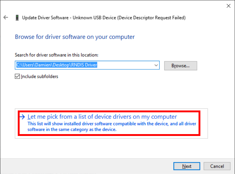 點擊 “Let me pick from a list of device drivers on my computer”(讓我從電腦上的裝置驅動程式清單中挑選)。