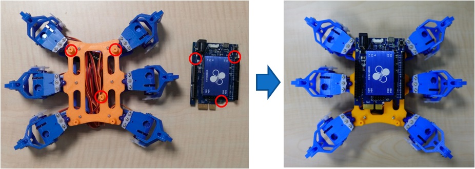 完成六個足部後接著就可以來組合身體,將 6 顆伺服機置於 body_bootom,如下圖: